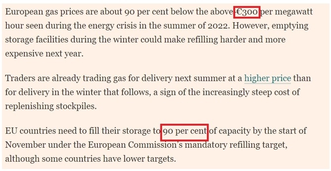 報(bào)道稱,雖然目前的歐洲天然氣價(jià)格較2022年夏季能源危機(jī)高峰期時(shí)的每兆瓦時(shí)超過300歐元的水平降低了不少,但在這個(gè)冬季清空儲存可能會使明年的再補(bǔ)充變得更加困難和昂貴。