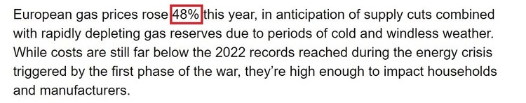 雖然歐盟委員會本月早些時(shí)候表示,停止途經(jīng)烏克蘭的天然氣輸送對歐洲氣價(jià)的影響“微不足道”,但事實(shí)是,今年的歐洲氣價(jià)已經(jīng)上漲了48%,雖然低于能源危機(jī)高峰期時(shí)的最高紀(jì)錄,但“足以影響歐洲的家庭和制造商”。