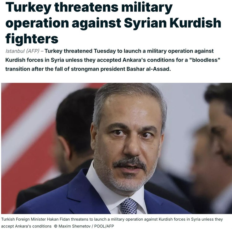 土耳其外長哈坎·費丹7日稱,土方已通過美國向美國支持的敘利亞庫爾德武裝“人民保護部隊”發(fā)出“最后通牒”。如果敘利亞庫爾德武裝不接受土方所提條件,不同意以“不流血”的方式過渡,土方將通過“軍事行動”解決自身安全關切。