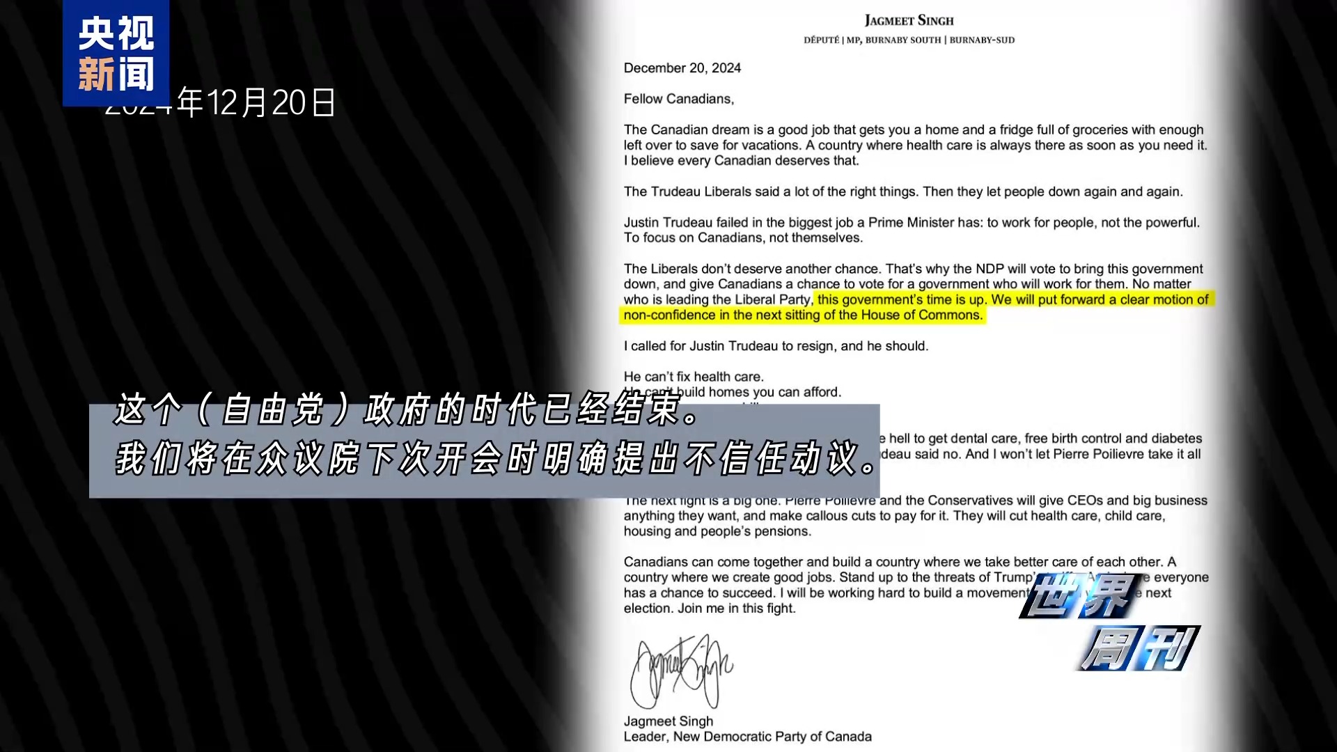 2024年12月20日,辛格再次發(fā)布聲明:自由黨政府的時(shí)代已經(jīng)結(jié)束。我們將在眾議院下次開(kāi)會(huì)時(shí)明確提出不信任動(dòng)議。