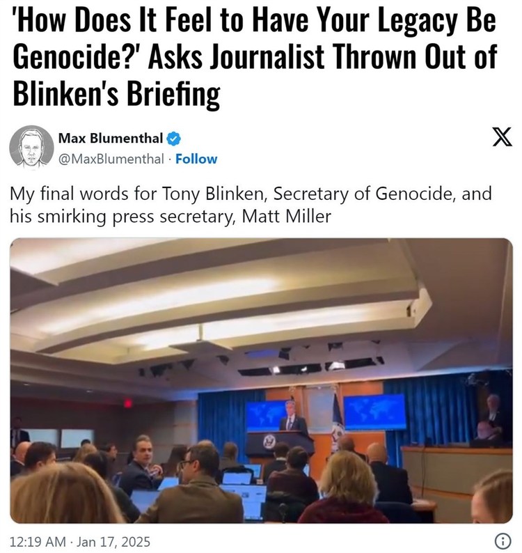 據(jù)報(bào)道,在布林肯發(fā)表講話后不到兩分鐘,他感謝出席的記者“提出了尖銳的問(wèn)題”,此時(shí),美國(guó)獨(dú)立新聞網(wǎng)站“灰色地帶”的記者馬克斯·布盧門撒爾 ,打斷了布林肯,大聲質(zhì)問(wèn)道:“有300名記者在加沙受到了你們的轟炸。我們?nèi)ツ?月達(dá)成了協(xié)議,你為什么還要繼續(xù)向以色列運(yùn)送炸彈?”