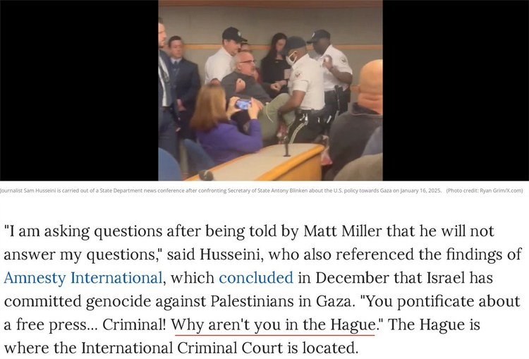抗議者高喊“你將永遠(yuǎn)被稱為‘血腥的布林肯,種族滅絕的國(guó)務(wù)卿’”,直至被現(xiàn)場(chǎng)工作人員帶走。