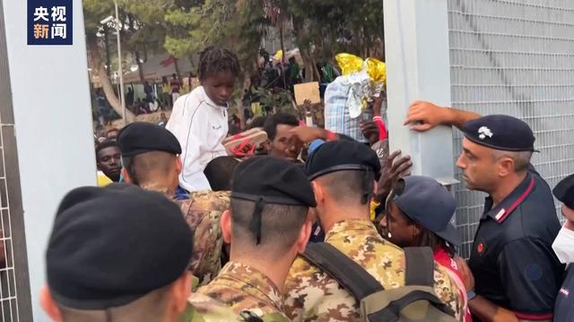 14日,大批非法移民翻越圍欄,沖進(jìn)蘭佩杜薩島的臨時(shí)移民接待中心。