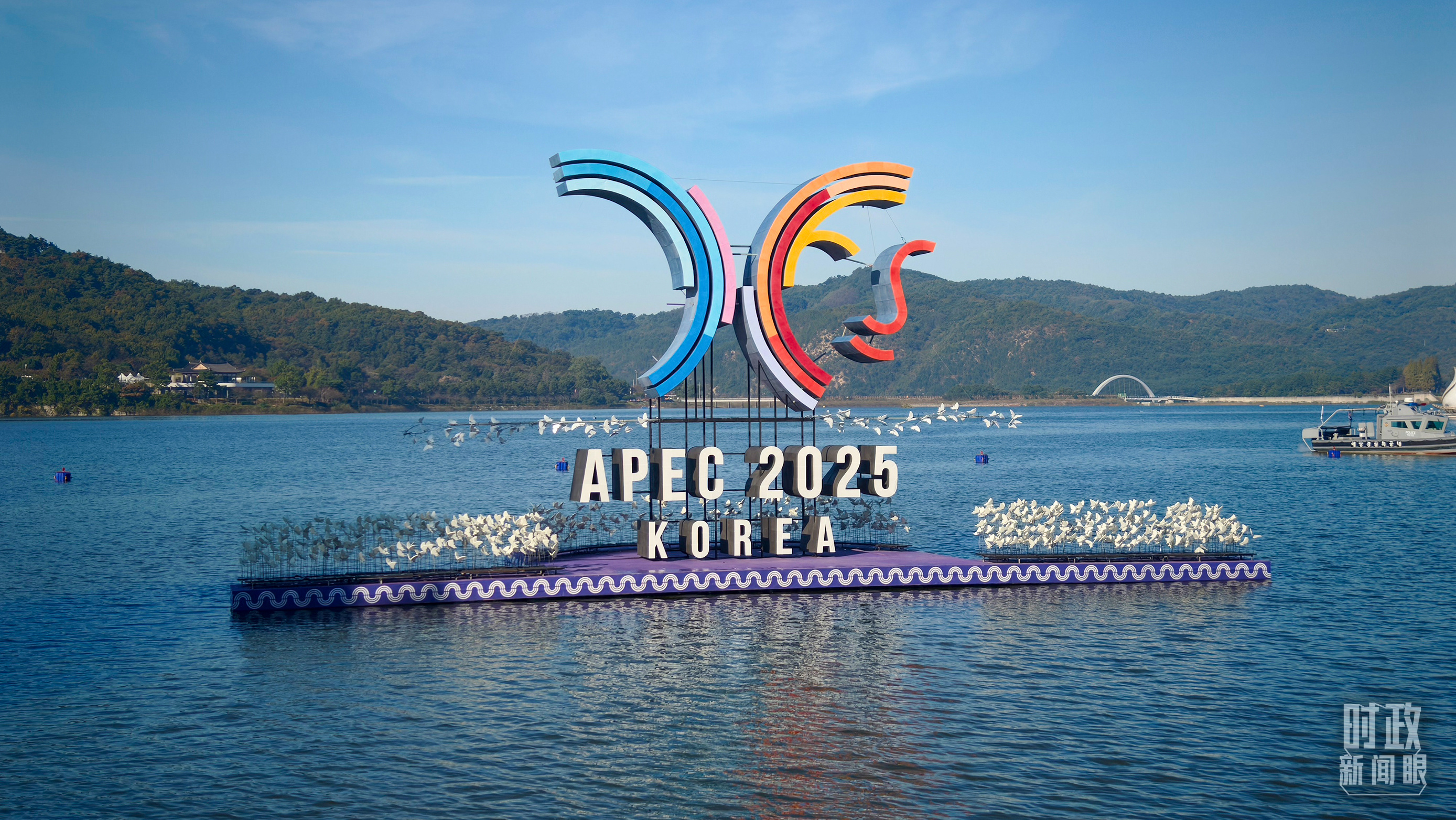 △慶州普門湖心的APEC會徽。(總臺央視記者鄂介甫拍攝)