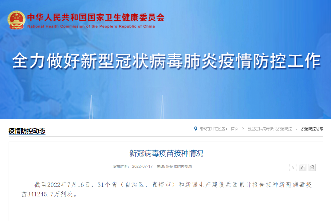截至2022年7月16日,31個(gè)?。ㄗ灾螀^(qū)、直轄市)和新疆生產(chǎn)建設(shè)兵團(tuán)累計(jì)報(bào)告接種新冠病毒疫苗341245.7萬劑次。