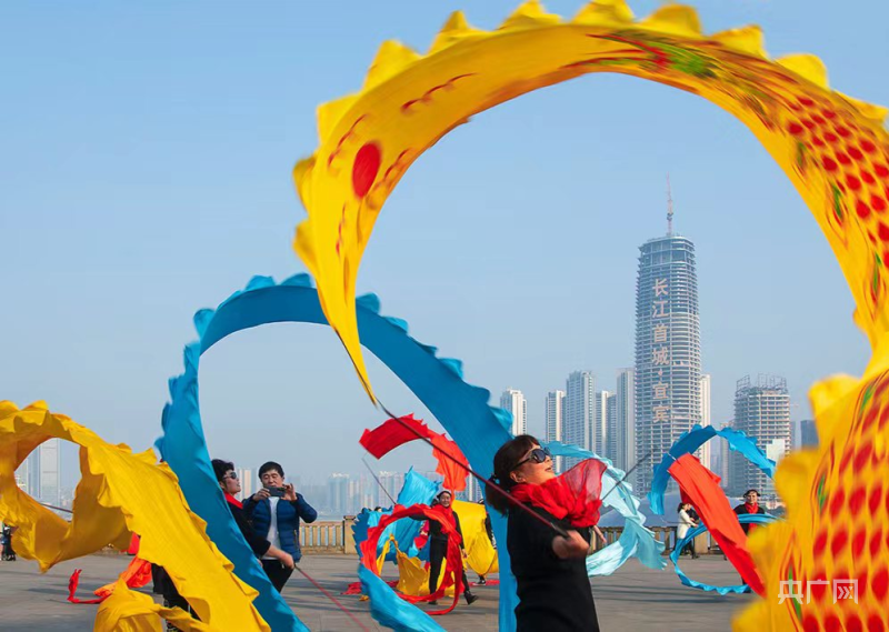 市民在江邊舞動(dòng)彩帶(央廣網(wǎng)發(fā) 張光金 攝)