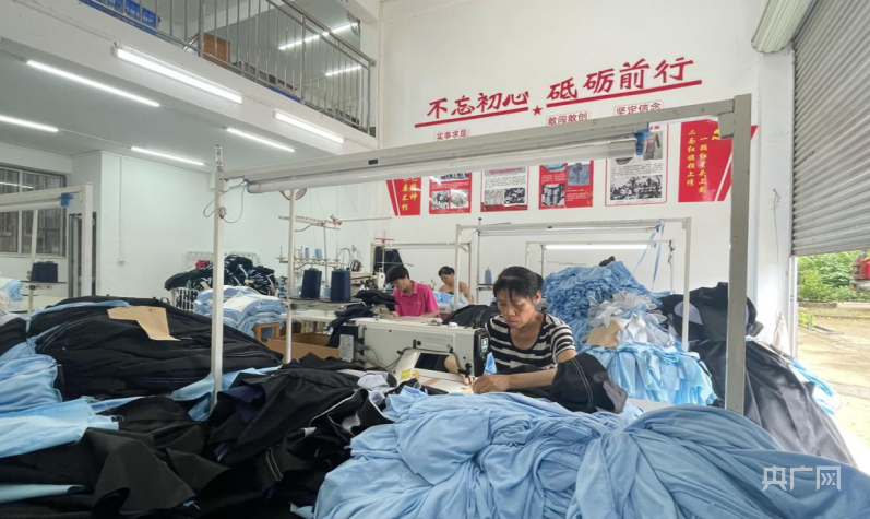 新聯(lián)村村民在紅軍古道景區(qū)的制衣車間趕制服裝(央廣網(wǎng)記者 羅蘭 攝)
