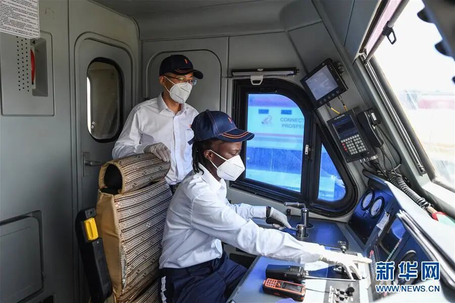 2021年3月22日,在肯尼亞首都內(nèi)羅畢,蒙內(nèi)鐵路指導(dǎo)司機(jī)楊明和他的肯尼亞女徒弟康西莉亞在機(jī)車內(nèi)進(jìn)行發(fā)車前的檢查工作。新華社記者 李琰 攝