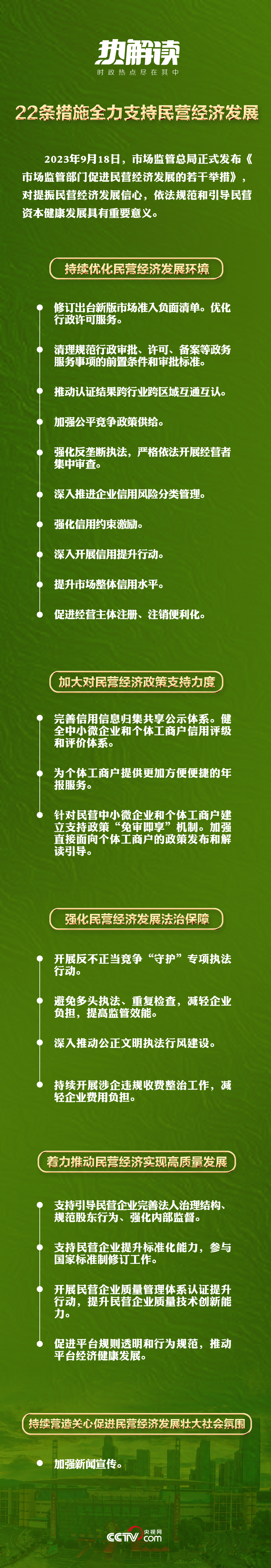 2023年7月14日,中共中央國務(wù)院出臺《關(guān)于促進民營經(jīng)濟發(fā)展壯大的意見》,對促進民營經(jīng)濟發(fā)展壯大作出新的重大部署。2023年9月18日,市場監(jiān)管總局發(fā)布《市場監(jiān)管部門促進民營經(jīng)濟發(fā)展的若干舉措》,通過22條措施為全力支持民營經(jīng)濟發(fā)展設(shè)計了具體落實的“施工圖”。
