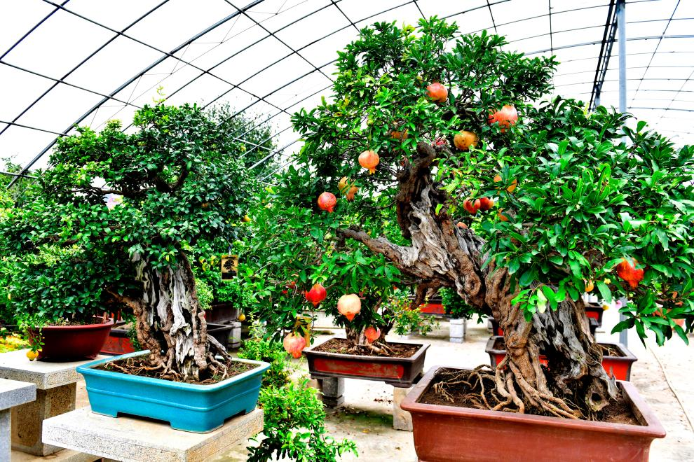 85后劉遠是山東省棗莊市嶧城區(qū)榴園鎮(zhèn)朱村村民。大棚里,劉遠蹲在盆缽前,刨出一圓坑,將石榴樹樁栽進盆中,小心修剪,擺弄許久,直到做出滿意的造型,才慢悠悠地把土合上。在他身后,從幾十厘米到幾米高的石榴盆景,千姿百態(tài)。
