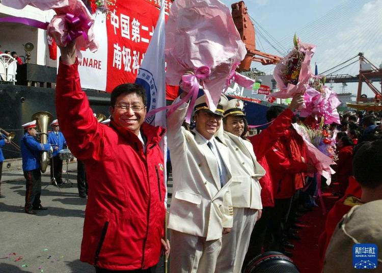 2005年3月24日,在中國(guó)第21次南極考察隊(duì)順利返航歡迎儀式上,領(lǐng)隊(duì)張占海(左一)揮舞手臂。 新華社記者 陳飛 攝