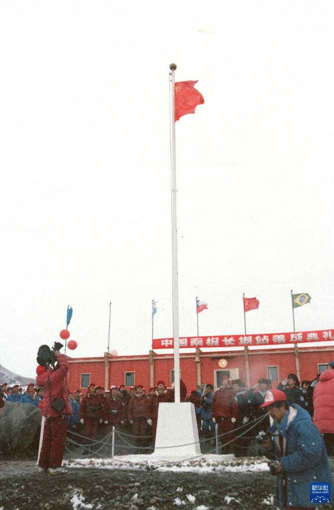 1985年2月20日,中國(guó)長(zhǎng)城站在喬治王島舉行落成典禮,南極洲上第一次升起了五星紅旗。新華社記者 朱幼棣 攝