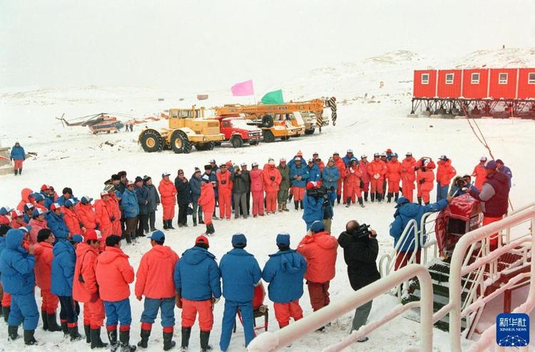 1989年2月26日,中國(guó)南極考察隊(duì)員參加中山站落成典禮。新華社記者 張繼民 攝