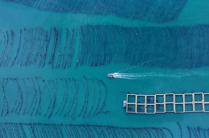▲一艘海上作業(yè)漁船在連江縣黃岐半島海域海洋牧場中穿行(7月3日攝)。 新華社記者 魏培全 攝
