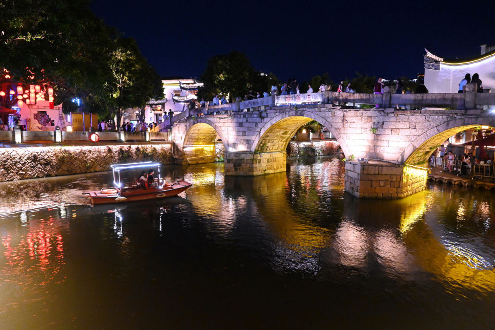 8月10日,市民游客在福州上下杭歷史文化街區(qū)的三捷河的三通橋上休憩游玩。
