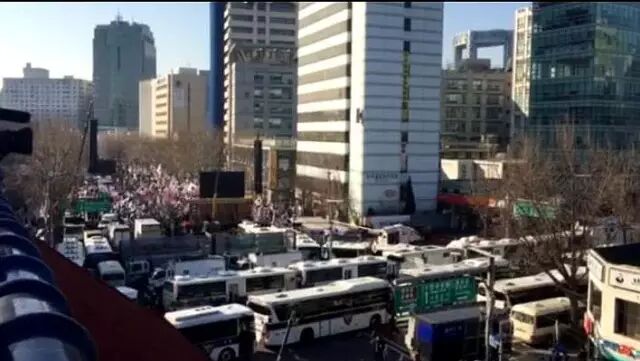 10日,韓國憲法法院外,警方嚴(yán)陣以待,采取出入管制。警方大巴車圍成車墻。
