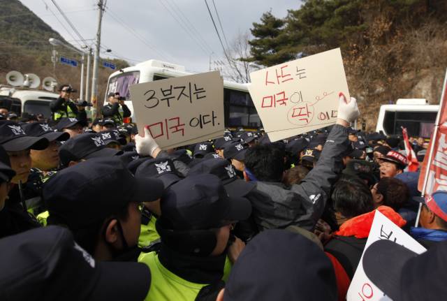 3月8日,在韓國慶尚北道星州郡的星州高爾夫球場附近,抗議民眾與警方對峙。新華社記者 姚琪琳 攝