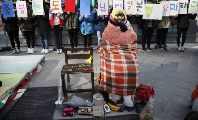 1月11日,在韓國首都首爾,學生們手舉標語與“慰安婦”少女像合影。當日,日本駐韓國大使館前的“慰安婦”少女像被穿上了厚厚的衣服,戴上了圍巾和手套。少女像旁,正在參加第1265次為解決日軍“慰安婦”問題示威的人群拿著象征“慰安婦”經(jīng)歷破繭而出的黃色蝴蝶標語,手舉寫著“我們不想在還沒被解放的國家生活”“反對撤回少女像”的牌子,反對韓日“慰安婦”協(xié)議的簽署。新華社記者 姚琪琳 攝