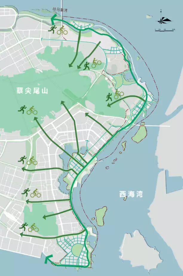 ③步行與自行車綠廊:串聯(lián)起蔡尖尾山體公園、大屏山公園、體育中心、自貿(mào)公園等開放空間。