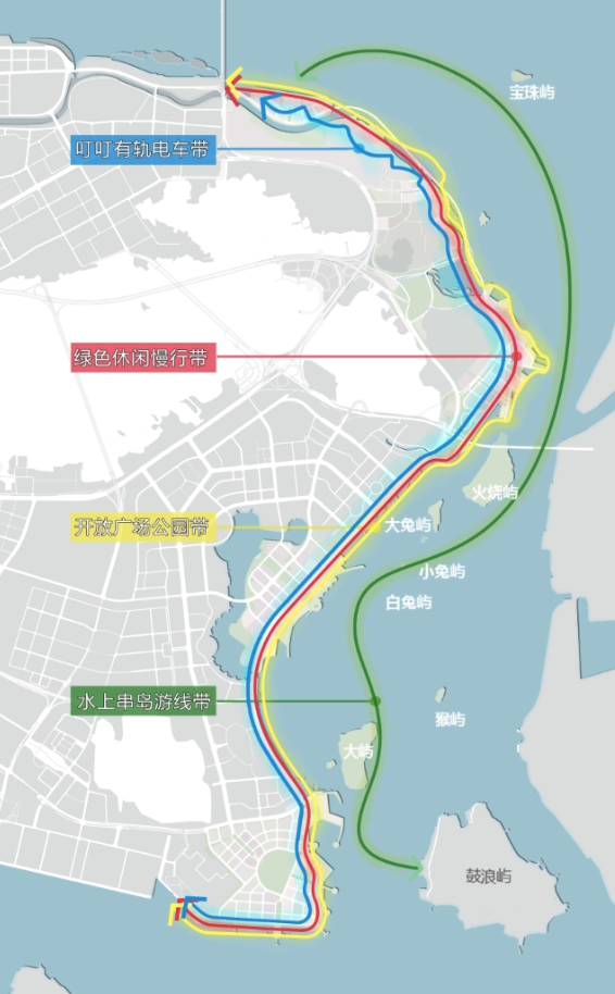 ⑤四個(gè)特色的有趣紐帶:叮叮有軌電車帶、綠色休閑慢行帶、開放公園廣場(chǎng)帶、水上串島游線帶。