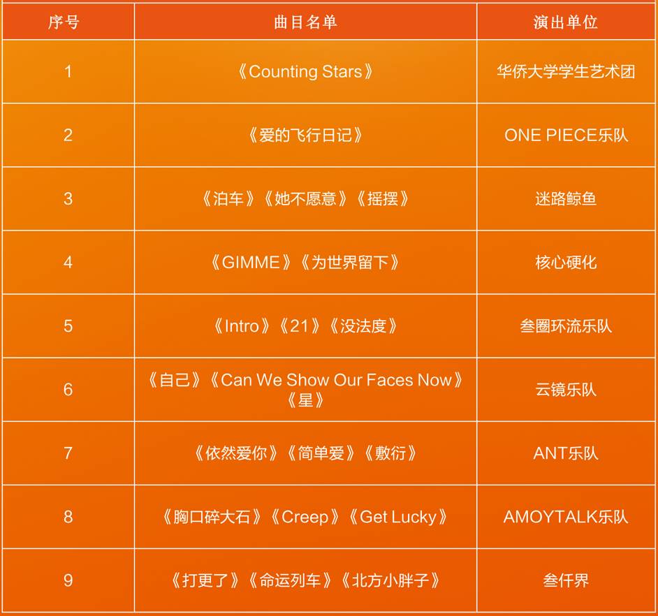 集合福建地區(qū)知名樂隊北極光樂隊、MIGO樂隊、薄荷綠樂隊及嘻哈廠牌自由種植的紅炭黑佬組合以及集美高校優(yōu)秀樂隊代表活人俱樂部,帶你嗨翻天。