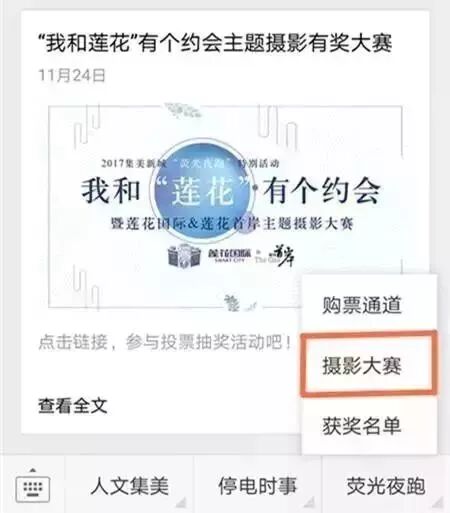 進(jìn)入“天下集美”微信公眾號界面,點(diǎn)擊[熒光夜跑]→進(jìn)入[攝影大賽]