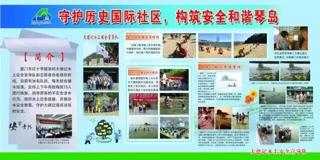 大德記海灘地形復(fù)雜,周邊礁石多。2013年,在市紅十字會的指導(dǎo),鼓浪嶼街道辦事處的大力支持協(xié)助下,鼓浪嶼大德記水上安全宣導(dǎo)隊正式成立。隊伍堅持常年駐守值班,設(shè)立海上圍欄線保護游泳者的安全,每天開展安全宣導(dǎo)工作,對危險的苗頭勸導(dǎo)在前,避免事故的發(fā)生。同時,還為一些在低潮線被礁石海蚵挫傷的客人提供簡易消毒包扎處理。