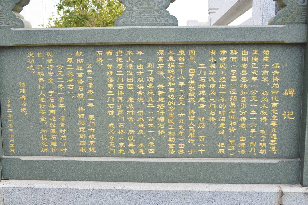橋的碑記和橋名在改造后被鐫刻在了護(hù)欄上,據(jù)說(shuō)村民介紹深青橋舊時(shí)也有碑記,只不過(guò)位置特殊,在石橋的底部。