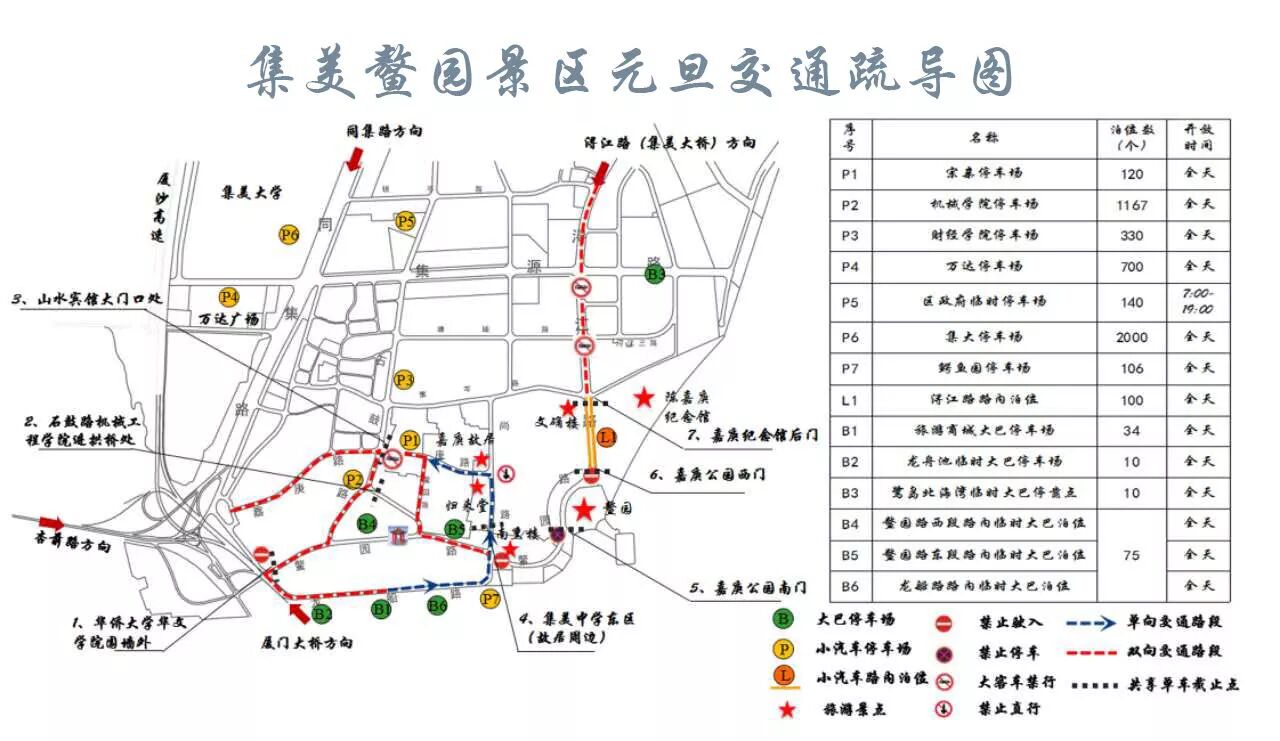 小型旅游車輛由集源路進(jìn)入潯江路,到嘉庚公園北門停放,由潯江路、集源路出景區(qū)。