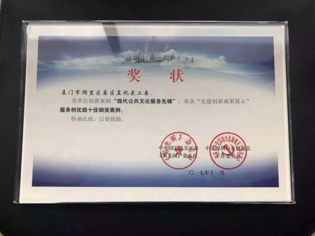 鞏固國家公共文化體系示范區(qū)先進區(qū)創(chuàng)建成果,公共文化建設(shè)持續(xù)領(lǐng)跑。2013年湖里區(qū)獲評廈門市“創(chuàng)建國家公共文化服務(wù)體系示范區(qū)先進區(qū)”稱號,2014年通過“全國文化先進單位”復(fù)評,2016年、2017年均圓滿通過市對區(qū)基層綜合文化服務(wù)中心考評,取得100%優(yōu)秀評價。2017年,湖里區(qū)文體出版旅游局“現(xiàn)代公共文化服務(wù)先鋒”機關(guān)黨建工作創(chuàng)新案例獲中央國家機關(guān)黨建創(chuàng)新成果展示十佳案例銅獎,是全國縣區(qū)級和福建省唯一獲此殊榮的單位。