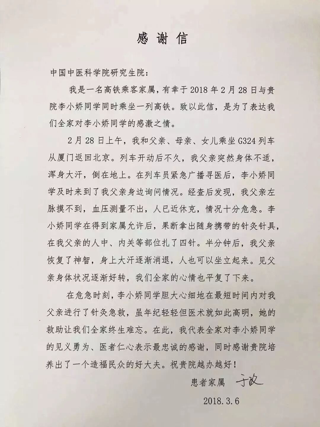昨天,于先生寄來感謝信,贊揚(yáng)李小嬌見義勇為、膽大心細(xì),是一個(gè)造福于民的好大夫。