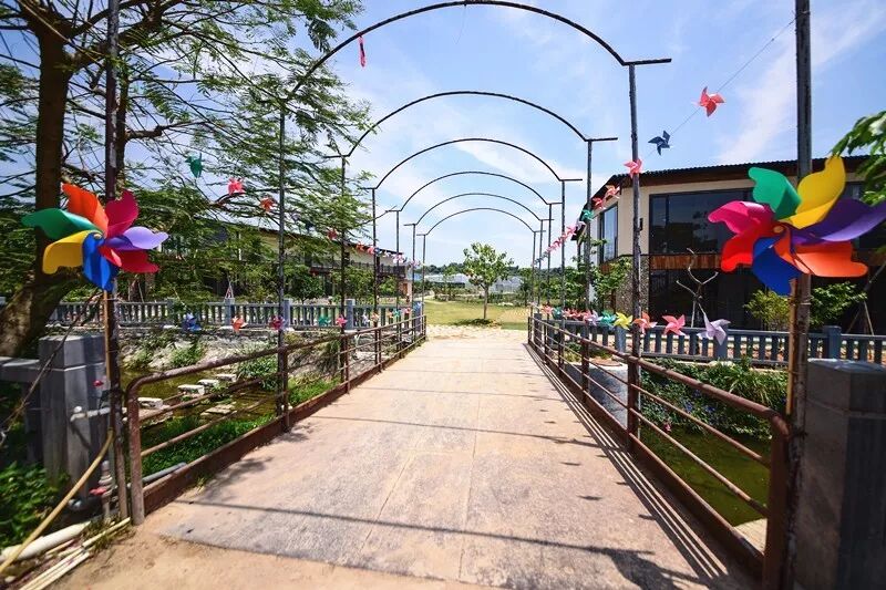 同樣是省級休閑農(nóng)業(yè)示范點的古樾山莊距離龍谷山莊只有3公里車程。這里是一片開闊的田園風(fēng)光,小橋流水、奇花異木之間升起炊煙裊裊。