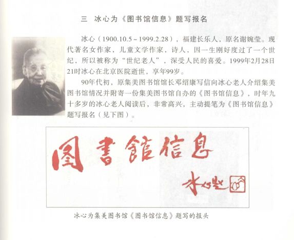 1992年10月23日,93歲高齡的冰心老人還主動(dòng)為集美圖書(shū)館自辦的圖書(shū)信息題寫報(bào)名。