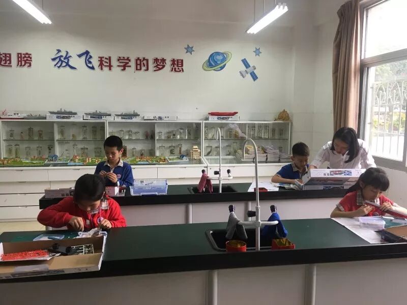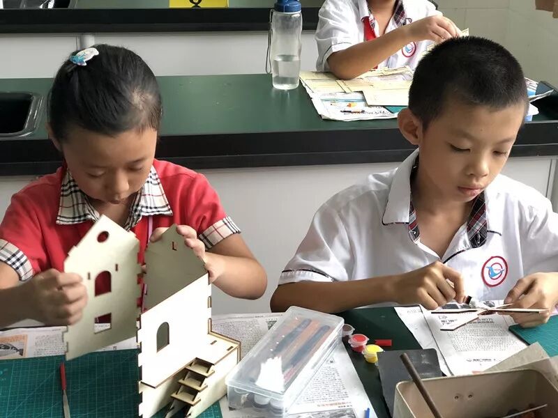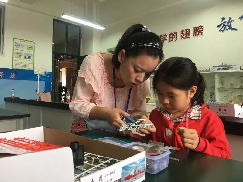 在科學組的航模制作課上,三年級的鄧文珺正小心翼翼地組裝著她的“雪龍?zhí)柨瓶即?rdquo;,這是她的第二只船模,“第一次拼的時候,速度很慢、感覺很難,滿手的膠水,花了3、4節(jié)課才拼好。”現(xiàn)在,有了經(jīng)驗的鄧文珺,已經(jīng)可以較為熟練地使用剪刀、銼刀、斜口鉗等工具,自己看著模型圖一步一步操作。