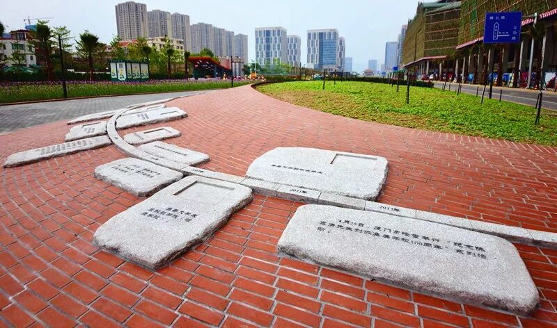 景觀綠化帶設(shè)計理念及設(shè)計構(gòu)思,呼應(yīng)本土的海濱地域特性,設(shè)計圍繞“海、島、橋”的意象,“綠地”為“島”;紅磚鋪地作為連接各個島嶼精神文化的“橋梁”;鋪設(shè)的灰色地磚則為“海”或“水”,連綿構(gòu)成一幅集美文化長卷,人文與自然融合彰顯集美新城中軸地域的文化特點。