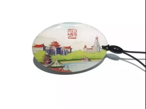 鎮(zhèn)紙的正面設(shè)計采用了紀(jì)念館外形簡筆畫及陳嘉庚誕生110周年的紀(jì)念郵票為主題元素,背面采用校友黃永玉先生的油畫作品《集美學(xué)村》為背景圖。鎮(zhèn)紙采用亞克力材質(zhì),整體設(shè)計簡潔明快。