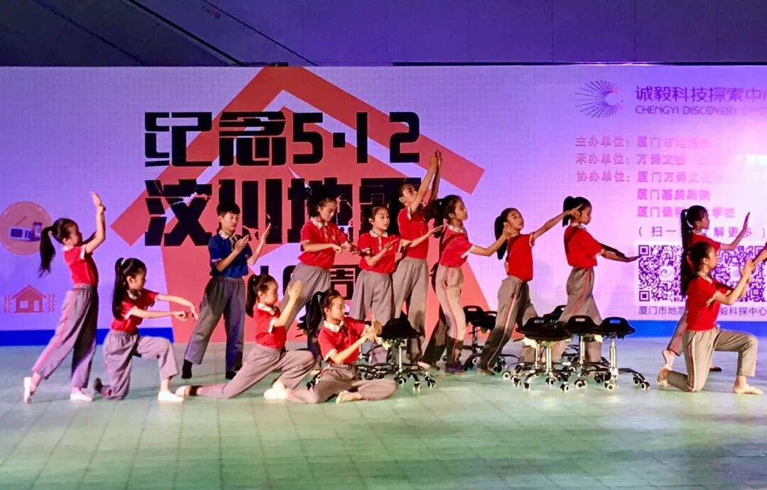 隨后,由廈門嘉庚劇院和廈門保利藝術(shù)學(xué)校專業(yè)老師指導(dǎo)的舞蹈《白金十分鐘》,以舞蹈形式傳遞防震減災(zāi)“急救白金十分鐘”知識。