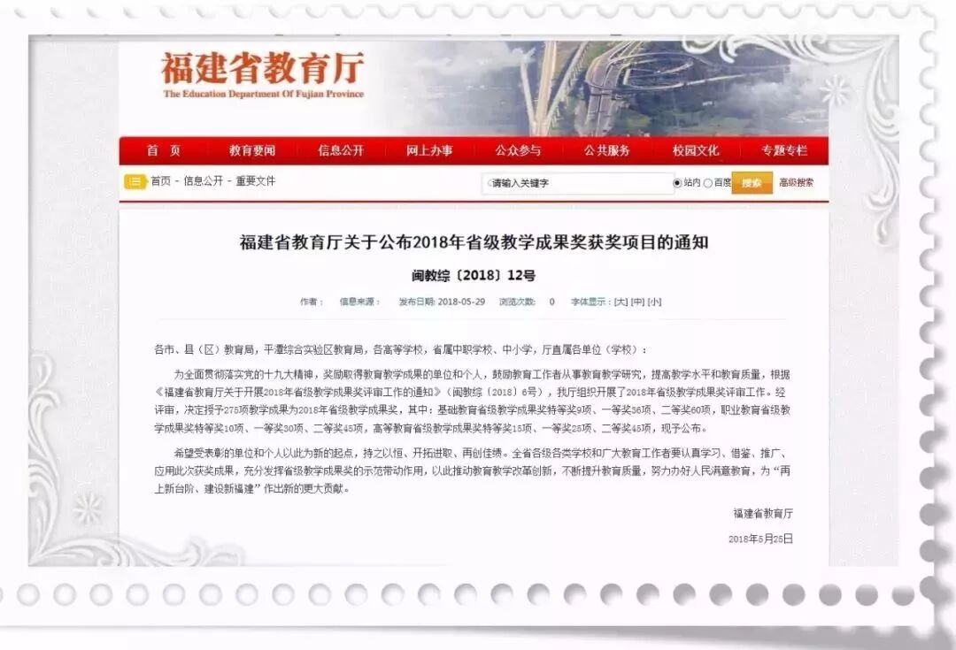 5月29日,福建省教育廳網(wǎng)站公布了《福建省教育廳關(guān)于公布2018年省級(jí)教學(xué)成果獎(jiǎng)獲獎(jiǎng)項(xiàng)目的通知》(閩教綜〔2018〕12號(hào) ),決定授予275項(xiàng)教學(xué)成果為2018年省級(jí)教學(xué)成果獎(jiǎng)。