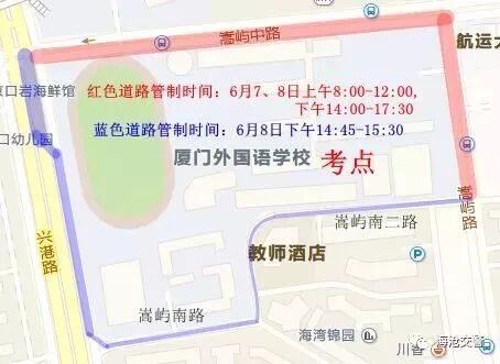 聽力考試期間管制措施:6月8日下午14:45-15:30,新增3條管制路段興港路東側(cè)輔道(嵩嶼南路口至嵩嶼中路口)、嵩嶼南二路、嵩嶼南路,禁止一切車輛通行。