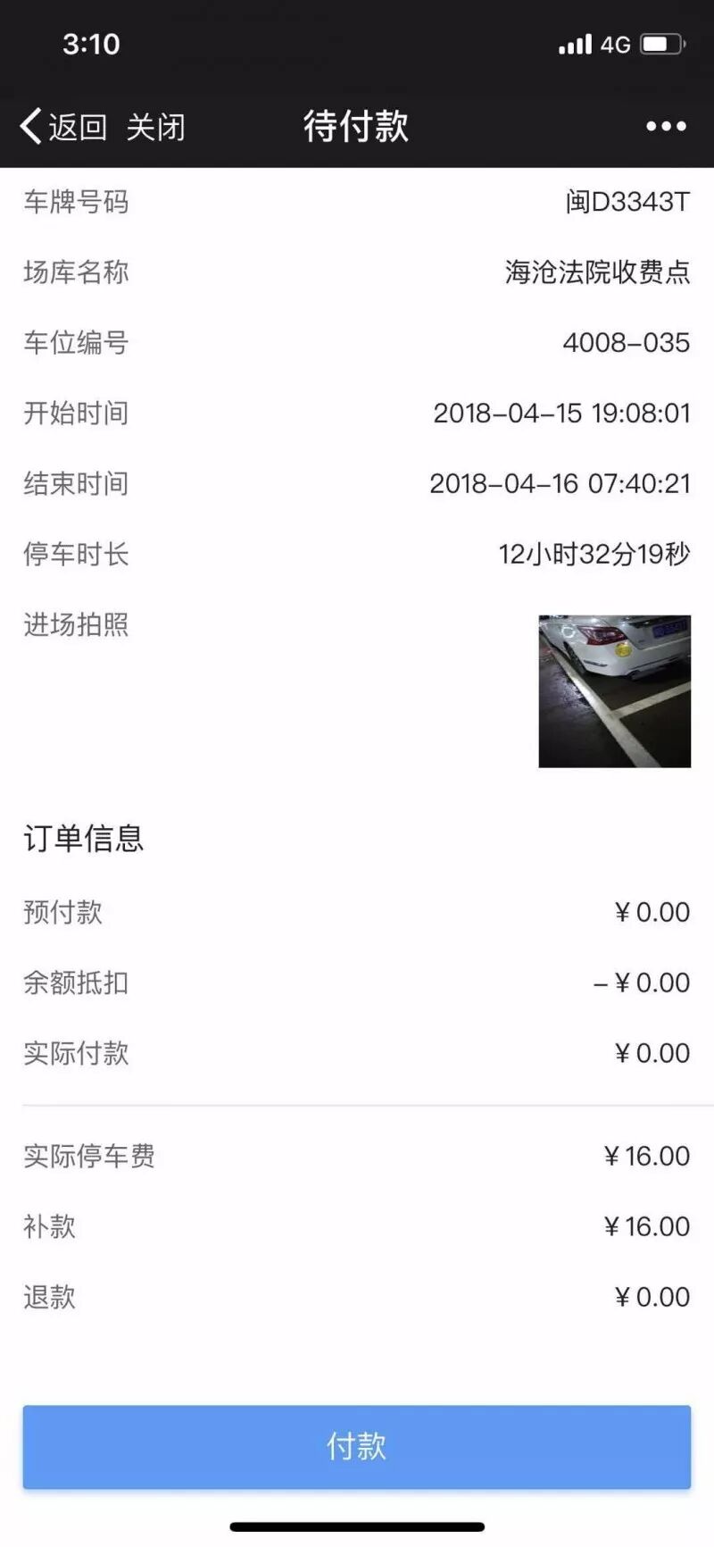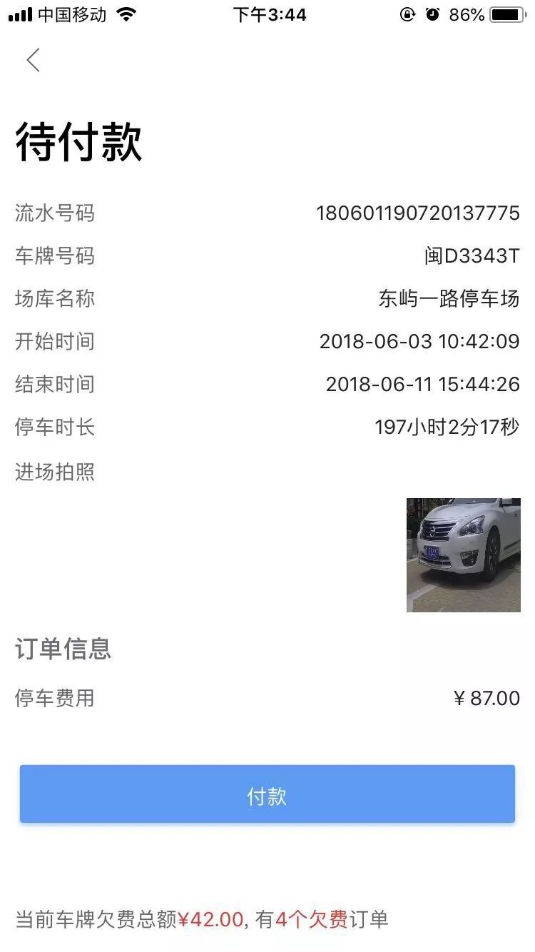 第四步:根據(jù)車牌號(hào)查詢到的待付款的訂單,點(diǎn)擊付款按鈕,進(jìn)行完成繳停車費(fèi)操作。