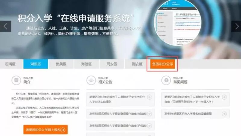 各位家長可登陸“i廈門惠民平臺”(www.ixm.gov.cn)“積分入學(xué)”欄目,點擊“各區(qū)積分公示”按鈕查看積分公示結(jié)果。具體如下圖紅框所示:
