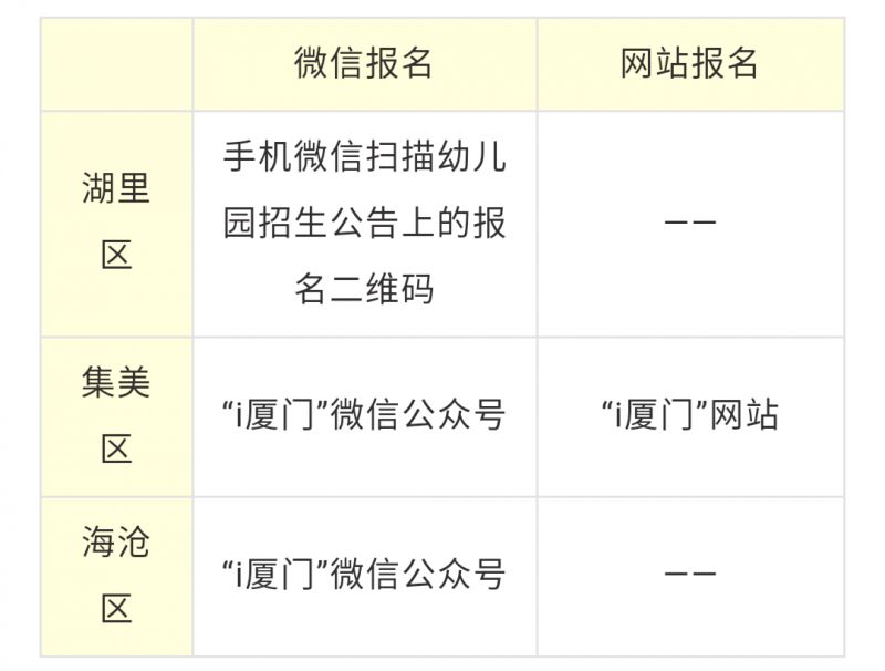 在各區(qū)教育局發(fā)布的幼兒園招生公告中,湖里區(qū)、集美區(qū)、海滄區(qū)明確提到將在今年開通公辦幼兒園的網(wǎng)上預(yù)登記,符合招生政策的適齡幼兒家長只需完成網(wǎng)上預(yù)登記,等待系統(tǒng)審核結(jié)果,并在規(guī)定時(shí)間內(nèi)到幼兒園現(xiàn)場確認(rèn)并提交材料。