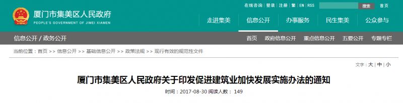 為了更好地扶持建筑業(yè)的發(fā)展、提升區(qū)域建筑行業(yè)的品質(zhì)和核心競爭力,集美區(qū)出臺了《關(guān)于促進(jìn)建筑業(yè)加快發(fā)展實(shí)施辦法》。