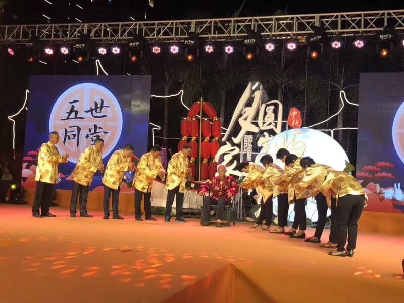 楊火樣坐在舞臺(tái)中央,孫兒們?nèi)霾璜I(xiàn)禮,重孫們獻(xiàn)上“福”字中國(guó)結(jié),玄孫們小跑著送上吉祥對(duì)聯(lián)……五世同堂其樂(lè)融融的一家,是家和萬(wàn)事興,百事孝為先的最佳“代言人”。