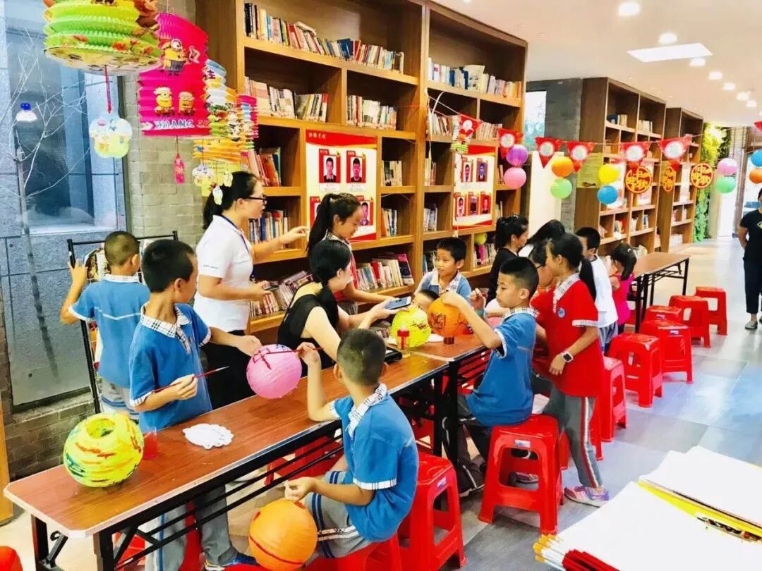 △洪塘?xí)簲y手臺胞助理洪巧娟邀請學(xué)生一同繪制創(chuàng)意燈籠,點亮中秋的祝福。