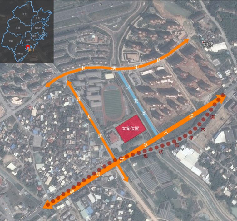 項目位于廈門市海滄區(qū)東孚鎮(zhèn)東孚大道以北,過坂路以東。項目北側為開闊的廈門一中海滄分校操場視野,西側為東孚規(guī)劃展示館,南側為東孚大道,東側為過蕓溪。