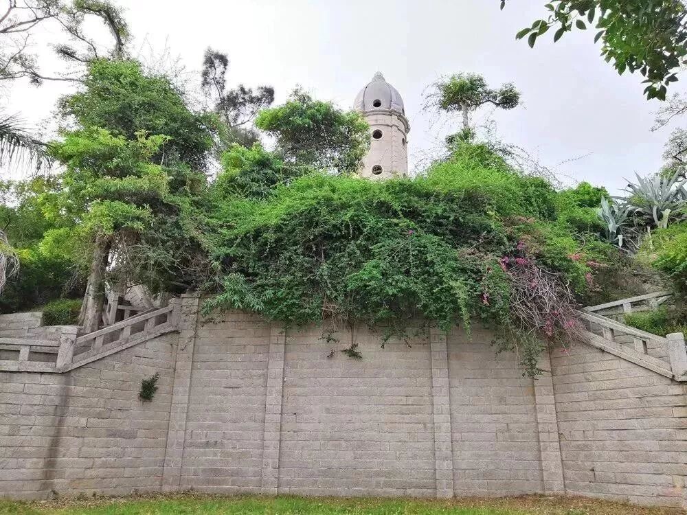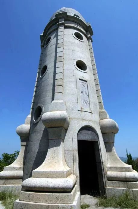 草木扶疏的寶珠嶼上,挺立著一座端莊秀美的圓柱形寶珠塔,塔高15米,通身由白色花崗巖砌成,頂部穹隆由五塊梯形花崗巖共同頂住一圓形石頭,組成“五龍奪珠”圖案,莊美大方。