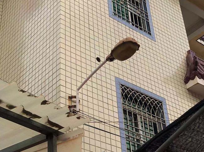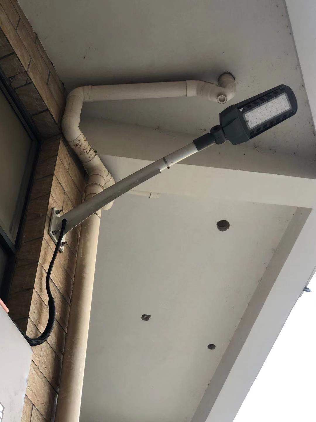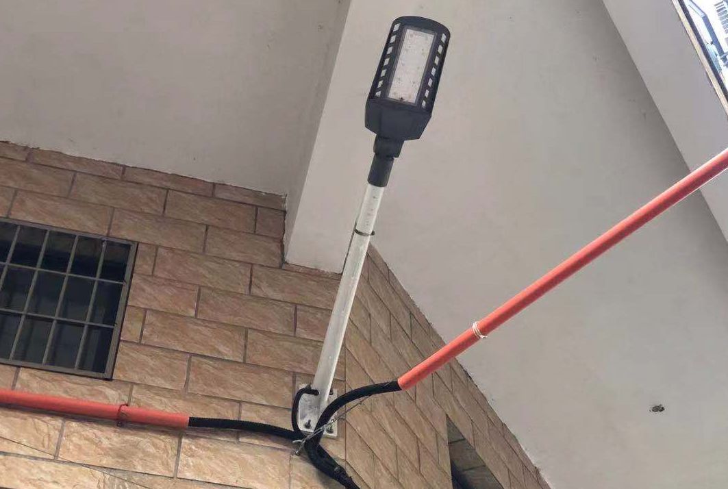 排頭新村:因為建筑物多有凸出,采用掛墻式路燈,并用管套保護線路