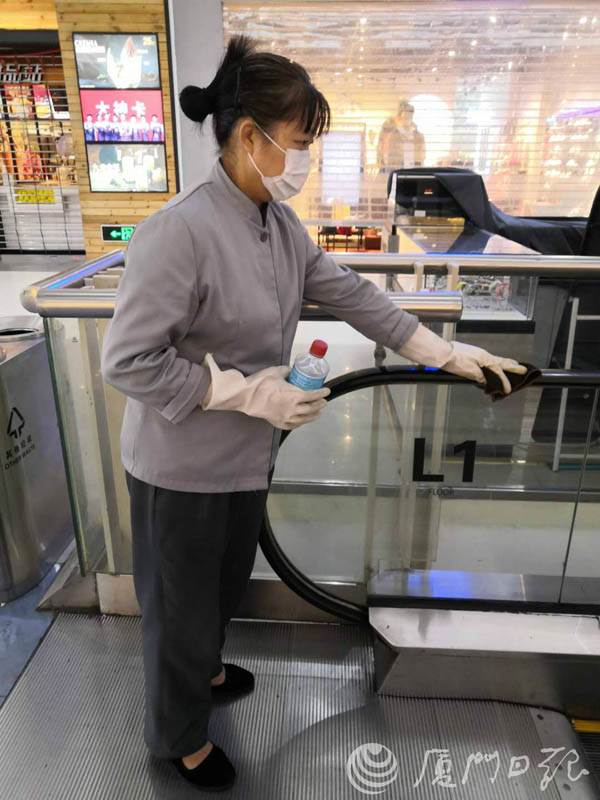 SM商管經(jīng)理陳碧瓊介紹,商場在1月20前就準(zhǔn)備好消毒藥水、藥品、口罩等疫情防控物資,員工佩戴口罩上班,早晚測量體溫,保潔人員每2小時(shí)對扶梯及欄桿扶手、電梯按鈕、洗手間、育嬰室等進(jìn)行消毒清潔。
