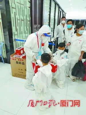 分流服務中心為入廈旅客送上“六個一”愛心袋(內含一瓶水、一盒廈門特產、一份溫馨提醒、一份入境流程圖、一個口罩、一份廈門日報),細致入微地營造安心、暖心、舒心的入廈體驗,彰顯“愛心廈門”社會大愛和守望相助的精神。